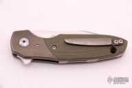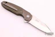 This Tarsus flipper from Brad Southard features a hand rub satin finished blade flipper. The handle has anodized titanium bolsters, liner and tip up pocket clip, green G-10 scales, orange peel finished titanium backspacer. Nice detent, lockup and blade seating. Knife flips well with no wrist action. Has a few light scratches, otherwise excellent condition.