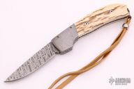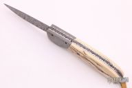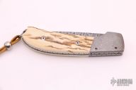 This Bolster Release Auto by Mike Whiskers Allen features a Damascus blade with fileworked spine. The handle has Damascus dovetailed bolsters, mammoth ivory scales, fileworked stainless steel liners and backspacer. "05 W 03" inside backspacer. Nice action, lockup and blade seating. Has a little patina on the bolsters, otherwise excellent condition.