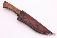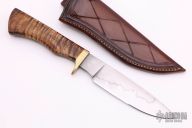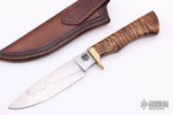 This knife by Doc Shiffer features a drop point hand rub satin finished blade with nice hamon, .176" blade stock and 1.197" blade depth, hidden tang construction. The handle has a brass guard with curly maple grip. Comes with a hand tooled brown leather sheath. New from maker. Comes with COA