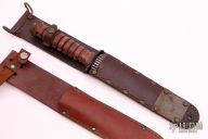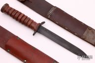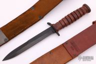 This Reproduction M3 from Camillus Knives features a black bayonet ground blade with sharpened top edge, .189" blade stock and .858" blade depth, hidden tang construction. The handle has a black steel guard and butt, and a stacked leather grip. Comes with 2 brown leather sheaths . Has some sheathing marks, otherwise excellent condition.