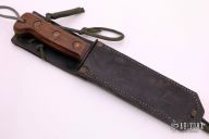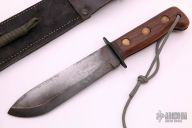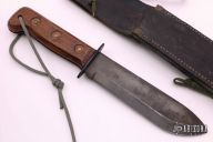 This Sheffield England M.O.D. Survival Bowie Knife (please let us know if you know who made this knife) features a blade with .226" blade stock and 1.746" blade depth, full tang construction with wood scales and copper rivets. Comes with a black leather sheath. Has some patina and light pitting, otherwise good condition for its age.