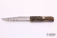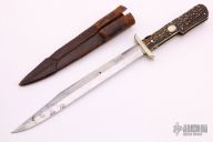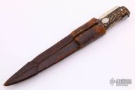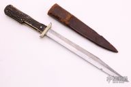 This Antique Folding Pig Sticker (I don't know if that is really what its called, but it seems appropriate, feel free to send me an email if you have more info) by Cogswell & Harrison features a polished clip point blade with false top edge. The handle has folding nickel silver swing guard, stag scales, coin edged brass liners, steel backspacer with picklock style lock. Comes with original brown leather sheath, although the stitching is split. Has some scratches and patina, otherwise good condition for an old antique knife.