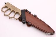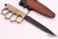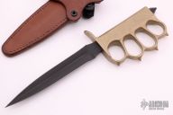 This MK1 Trench Knife by Les George features a black Cerakote double edged blade with .190" blade stock, .998" blade depth, hidden tang construction. The handle has a cast brass knuckle guard grip with a skull crusher. Comes with a brown leather scabbard by Chattanooga Leatherworks. Comes with a zippered case. New from maker at the 2021 Blade Show.