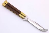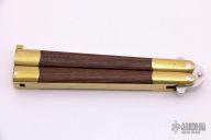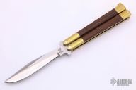 This Balisong features a bowie blade ground by Jody Samson. The handle is comprised of integral dovetailed brass handles with wood inlays. Brass T latch on pommel. Some dings on the brass and some light scratches throughout, the knife is in good condition otherwise.