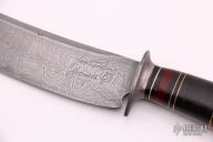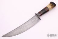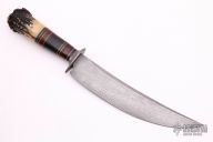 This Scagel Style Camp Knife by James Batson features a Damascus blade with false top edge, .177" blade stock and 1.641" blade depth, hidden tang construction. The handle has a Damascus guard, crown stag butt with nickel silver pin, and a spacer pattern consisting of leather, nickel silver, red linen micarta and brass. Has some scratches, otherwise excellent condition.