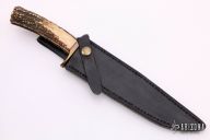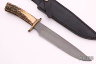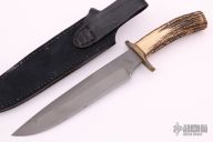 This custom fighter by John Greco features a grey coated blade with a false top edge, .240" blade stock, 1.475" blade depth, hidden tang construction. The handle has a brass guard and butt, stag grip and red/brass spacers. Nice feel in hand. Comes with black leather sheath. Has a couple marks on the blade, but they were there when he made it and before it was coated, otherwise excellent condition. #5 stamped on ricasso.