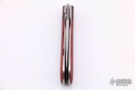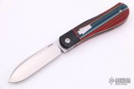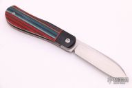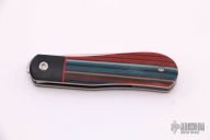 This Dogleg Front Flipper by Enrique Pena features a hand rub satin finished drop point blade with a notched thumbrest and front flipper. The handle has black canvas micarta bolsters, canvas micarta scales over red liners, canvas micarta backspacer.  Stainless steel shield. Includes padded zippered case. New from Maker!