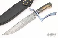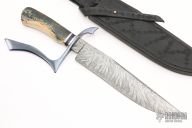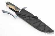 This beautiful knife by Journeyman Smith Kelly Vermeer Vella features a Damascus blade with false top edge, .208" blade stock and 1.671" blade depth, hidden/frame tang construction. The handle has a blued steel guard that has a three-tone effect she calls "Black Ice", the spacers are old files filled with black epoxy and a blued and fluted center spacer, beautiful mammoth ivory scales and steel frame. Comes with a hand tooled black leather sheath and a zippered case. New from maker at the ICCE show. Kelly's work stopped me in my tracks as I was walking through the show. She does amazing work!