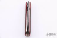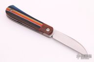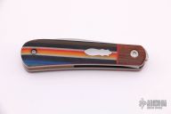 This Swayback Front Flipper by Enrique Pena features a hand rub satin finished wharncliffe blade with swedge, notched thumbrest and front flipper. The handle has canvas micarta bolsters, canvas micarta scales over red liners, canvas micarta backspacer. Stainless Steel Shield.  Includes padded and zippered case. New From Maker.