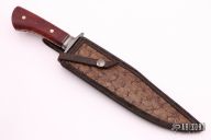 This Bowie by Master Smith J.W. Randall features a Damascus blade with false top edge, .226" blade stock and 1.779" blade depth, hidden/frame tang construction. The handle has a Damascus guard, fileworked steel frame, wood scales with bronze spacer and corby bolts. Comes with a brown leather sheath with crocodile skin inlay and a nylon zippered case. New from maker at the 2021 ICCE show.