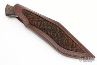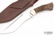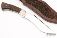 This Kukri by Tyler Turner features a mirror polished blade with hollow ground false top edge, .252" blade stock and 1.600" blade depth, full tapered tang construction. The handle has nickel silver bolsters, checkered walnut scales with nickel silver pins. Comes with a brown leather sheath with buffalo hide? inlay. Comes with a zippered case. Has a couple very light scratches, otherwise excellent condition.