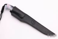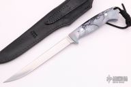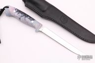 This Fillet Knife by Paul LeBatard features a satin finished blade with .099" blade stock and .720" blade depth, full tapered tang construction. The handle has Abalone Alumilite scales with blue liners. Comes with a black leather sheath and COA. New from maker at the 2021 ICCE show.