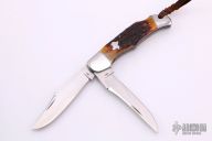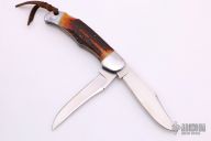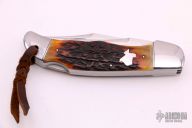 This large Utility folding knife by Tobin Hill is half lockback half slipjoint; both blades are satin finished and feature single nail nicks.  The handle features satin finished front/rear thread bolsters, jigged bone covers and a stainless steel shield.  This is a unique piece.  New from maker.