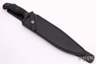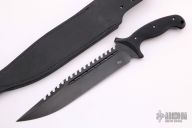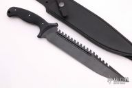 This Razorback from Knife Makers Guild President Todd Begg features a black blade with fullers and sawteeth, .271" blade stock and 1.725" blade depth, full tang construction. The handle has textured black G-10 scales. Comes with a black leather sheath and a zippered case. New from maker!