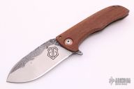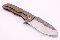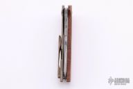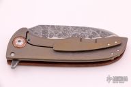 This GutShovel Splitter from John Gray Knives features a hand forged blade with flipper, forge finished flats and satin grinds. The blade was hand forged by Luke Dellmyer. The handle has a cross cut natural canvas micarta front scale, a barked and anodized titanium lockside and matching titanium tip up clip, has copper pivot collars. Nice detent, blade seating and lockup. New from maker at the 2021 ICCE show.