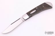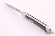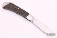 This slipjoint by Stanley Buzek features a hand rub satin finished blade with long pull nail nick. The handle has stainless steel bolsters with integral liners that have filework along the spines, mammoth bone scales, stainless steel escutcheon, stainless steel spring. Has half-stop, flush in all positions. Comes with a zippered case. New from maker at the 2021 ICCE show.