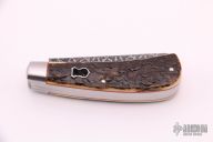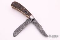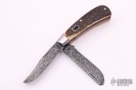 This Two-Blade Trapper by Chris Sharp features his Patent Pending see-through escutcheon. This knife has a 1075/15N20 Damascus blades with nail nicks. The handle has 416ss bolsters with integral liners and escutcheons, bark mammoth ivory covers with orange liners, filework on liners, stainless steel springs. Has half-stop, flush in all positions. Comes with zippered case and COA. New from maker at the 2021 ICCE show.