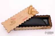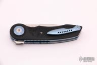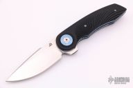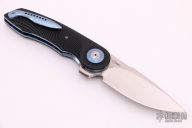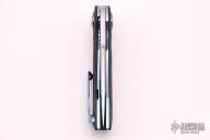 This knife by JD Van Deventer features a drop point hand rub satin finished blade with swedge and notched flipper. The handle has milled black G-10 scales with anodized titanium pivot collars, anodized titanium liners with fileworked spines, tip up textured and anodized titanium clip, black G-10 backspacer with lanyard pin. Rides on IKBS. Comes with original box and leather zippered case. Excellent condition.