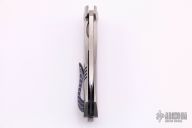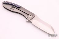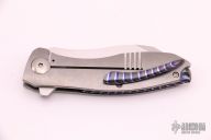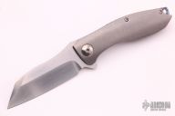 This Collaboration piece by Jim Burke and Jeremy Marsh features hand rub satin finished blade with flipper. The handle features a tumbled titanium frame with zircuti backspacer and tip up clip with hidden screws. Comes with a zippered case. Excellent condition.