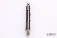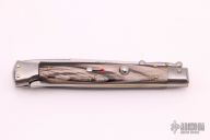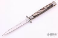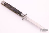 This 11" Swing Guard Auto by Frank Beltrame features a polished dagger ground blade with false top edge. The handle has stainless steel bolsters, front and rear, buffalo horn scales, brass liners, stainless spring. Excellent condition.