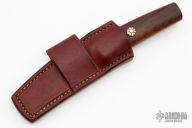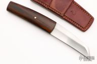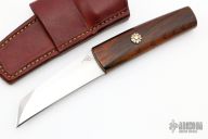 This Reverse Tanto by Paul Cooper features a hand rub satin finished wharncliffe blade with slight hawkbill and a sharpened front edge, .127" blade stock and 1.046" blade depth, hidden tang construction. The handle has a cocobolo grip with a mokume flower and copper pin. Comes with a brown leather sheath. Excellent Condition.