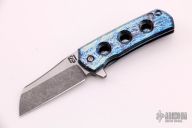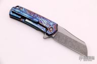 This Imp Framelock Flipper by NCC Knives features a hand ground stonewashed blade. The handle has a Ragnarök anodized titanium frame with titanium hardware and tip up clip with hidden screws. Comes with original box. New from maker at the 2021 ICCE show.