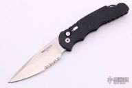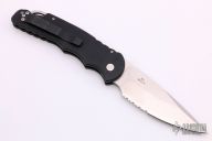 This Tactical Response 4 has a stonewashed partially serrated blade, and a black aluminum handle. Black stainless steel clip, tip up carry. Steel glass breaker. Secondary safety switch. Comes with original sheath, box and papers. Has some scuffs on the handle, good condition.
