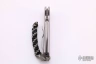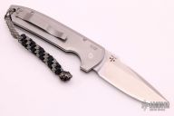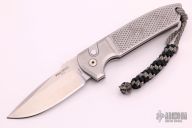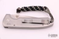 This Les George Rockeye Auto Ltd 1st Run #11 of 50 has a tumble finished drop point blade with notched thumb rest. Handle is tumbled stainless steel frame, black lip pearl inlaid push button, satin stainless steel tip up clip, and lanyard hole. Comes with original box and papers. Excellent condition.