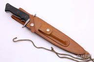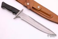 This Model 2 by Walter Brend features a double hollow ground blade with a matte finish and sawteeth on the spine as well as a sharpened top edge, .323" blade stock and 1.545" blade depth, full tang construction. The handle has a matte finished titanium double guard, and black linen micarta scales, hollow tube pins and lanyard hole. Comes with a brown leather sheath. This knife is beautiful and sports the "Walterboro SC" logo.  Has a few scuffs, otherwise excellent condition.