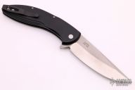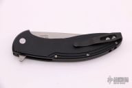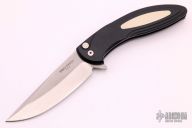 This Cambria flipper by Pro-tech features a stonewashed blade with flipper. The handle has a black aluminum frame with ivory paper micarta inlay in the frame and push button, tip up black deep carry stainless steel clip. Rides on bearings, nice detent, lockup and blade seating. Has some light scuffs on the frame, otherwise excellent condition. Comes with original box and papers.