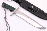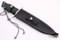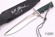 This Model 2 by Walter Brend features a double hollow ground blade with hand-rubbed satin finish, and a 6.5" sharpened top edge, .261" blade stock and 1.646" blade depth, full tang construction. The handle has a satin finished titanium double guard, and green canvas micarta scales, hollow tube pins and lanyard hole. Comes with a black leather sheath, signed and dated 11/01/2019.  This knife is beautiful and sports the "Etowah, TN" logo. Has a few light scuffs on the handle, otherwise excellent condition.