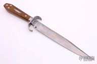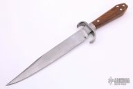 This Helles Bell Bowie from Bill Bagwell features a satin finished blade with sharpened top edge, .352" blade stock and 1.389" blade depth, hidden tang construction. The handle has a steel guard and spacer with a wood handle and stainless steel hardware over a hidden tang construction.  Has a few light scratches, otherwise excellent condition.