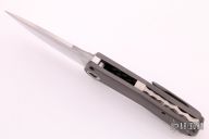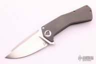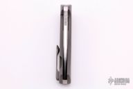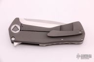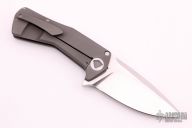 This Volt Flipper by Sharknivco features a hand rub satin finished blade with flipper and notched thumbrest. The handle has a bead blasted titanium frame with custom pivot, tip up bead blasted titanium clip, orange peel finished titanium backspacer. Excellent condition.