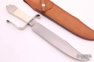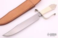 This Bowie by Jason Knight is a replica of a bowie out of the Moran Book. It features a hand rub satin finished blade with sharpened top edge and visible temper line, .273" blade stock and 1.608" blade depth, hidden/frame tang construction. The handle has a forged nickel silver guard, mammoth ivory scales, nickel silver butt and frame, with a nickel silver finial at the butt. This knife is marked with the Journeyman Smith "JS". Comes with a brown leather sheath. Has a few light scratches, otherwise excellent condition.