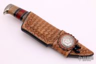 This My Knife by D'Alton Holder features a mirror polished drop point blade with fileworked spine, .154" blade thickness and .858" blade depth, hidden tang construction. The handle has an engraved nickel silver guard and butt with deeply engraved cougar, done by Bruce Shaw, The grip consists of oosic, buffalo horn and red amber (acrylic) grip with black and nickel silver spacers. Beautiful combination of materials and excellent workmanship. Comes with a brown leather sheath and padded zippered case. Excellent condition.