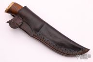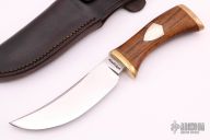This knife by Jay Hendrickson features a satin finished blade with visible temper line, .242" blade stock and 1.24" blade depth, hidden tang construction. The handle has a brass guard and butt, black ash grip and a stainless shield. Comes with a leather sheath. Excellent condition.