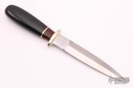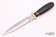 This early Cooper Style Dagger by Jody Samson features a satin finished double edged blade with .184" blade stock and .874" blade depth, hidden tang construction. The handle has a brass guard, black linen micarta grip and brass/brown canvas micarta spacers. Has some light scratches, otherwise excellent condition.
