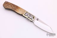 This Scott Sawby Small Combat Utility folder has his patented self lock system. The blade is mirror finished with a single checkered thumbstud. The handle has dovetailed stainless steel bolsters and liners, bolsters have been engraved with gold inlays, wood scales, stainless steel backspacer. Has a couple light scratches, otherwise excellent condition.