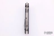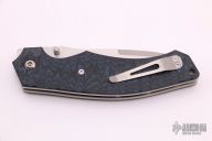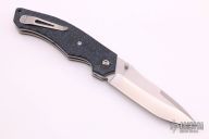 This Bounty Hunter by Jeff Hall features a satin finished spear point blade with swedge, dual thumb studs and notched thumb rest. The handle features blue/black G10 scales over titanium liners and stand-offs. Titanium tip down clip and lanyard hole in pommel. Excellent Condition.