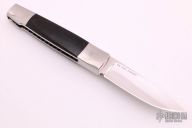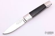 This Barry Wood swing lock folder features a mirror finished blade and polished stainless steel frame with black linen micarta scales. This is a very unique scissor opening folder, which when the blade is fully open and locked in place is almost a fixed blade knife. The handle is nicely contoured for a comfortable grip. Opening is accomplished by lightly pressing down and outward at the rear indentation on the spine, which releases the locking pin and allows one side of the handle and the blade to rotate down then forward until the blade locks in the forward position. The one side of the handle continues to rotate back until it locks in place. Closing requires the same slight thumb pressure at the indentation to release the locking pin, then the one side of the handle is rotated back and around, catching the blade and aligning both with the other side of the handle in a locked closed position. Nice  function. Few light scratches on handle and blade, but excellent condition for age. #45-144 inside frame.