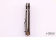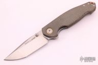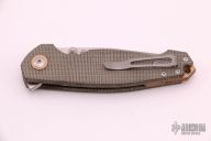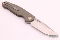 This Katla has a green micarta handle and a stonewashed blade. Copper pivot collars and backspacer.