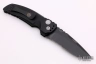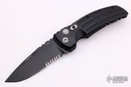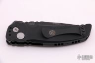 This EX-A01 by Hogue Knives is an Allen Elishewitz design, it features a black partially serrated 154CM blade with notched thumbrest. The handle is black aluminum, tip up or down reversible black stainless steel clip. Has safety. Comes with Hogue box, sheath and papers. Excellent condition.