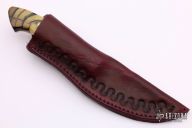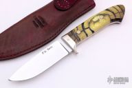 This drop point hunter by Phillip M Parris features a mirror polished blade with .189" blade stock and 1.139" blade depth, full tapered tang construction. The handle has a nickel silver guard with mosaic pin, stabilized and cross cut mammoth ivory scales with mosaic pins. Comes with a leather sheath. New from maker.