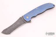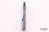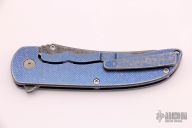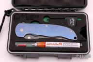 This Norseman (#4534) by John Grimsmo features an acid tumbled blade with a single titanium thumb stud, notched thumb ramp and flipper. Distressed ble anodize finished and crosshatch textured titanium frame with titanium screws. Very smooth action that requires no wrist movement. Nice detent, lockup and blade seating. Rides on ceramic bearings. Knife is in excellent condition, shows no signs of use or carry. Comes with original custom hard case, Nano-Oil, tool, and COA dated Jan 25, 2021.