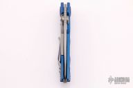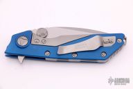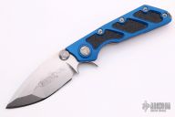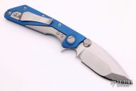 This DOC framelock flipper is a collaboration between A. Marfione and M. Strider, their names are on the clip. The blade is stonewashed with a standard edge, dual thumb-studs, flipper and a notched thumbrest. The handle is blue aluminum with non-slip inserts, and a bead blast stainless steel clip, tip up carry. Comes with original box and papers. Dated 12/2013 and serial number 02020. Has a couple light scratches, has been resharpened, very sharp, otherwise good condition.
