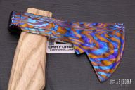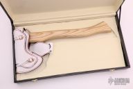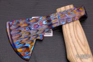 This Axe by Ema Forge features an 84 layer 2-Alloy MokuTi head with hammer pole. It is hung on a 19" ash handle. Comes with a red/white leather sheath with mokume latches. Comes with original presentation box. New from maker.