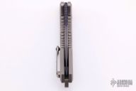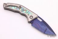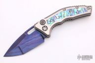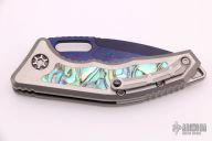 This Medusa by Heretic Knives features a Blued Damascus multi-ground tanto blade with false top edge, notched thumbrest. The handle has a two-tone titanium frame with abalone inlays, checkered push button, two-tone titanium backspacer and a tip up clip with ceramic ball. Comes with original box, COA, zippered case and drawstring bag.  S/N 007 and dated 06/19.  Excellent Condition.