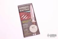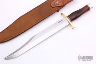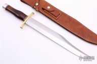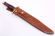 The 13" Randall Thorp Bowie by Randall Made Knives is similar to types used by Confederate troops. This one has an 13" carbon steel blade with sharpened top edge, .253" blade stock and 1.616" blade depth, hidden tang construction. The handle has a brass lugged guard, duralumin butt cap, and a stacked leather grip with red/white/blue spacers. Comes with a brown leather sheath, Randall Knives patch and original papers. Excellent condition.