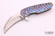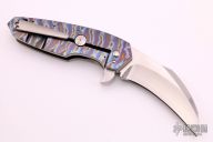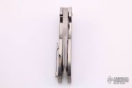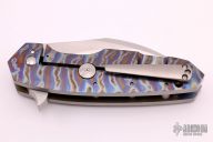 This Monster Fatty Kobra Flipper by Reese Weiland has a hand rub satin finished blade, .361" blade stock. Handle has a flamed titanium frame with satin stainless steel standoffs and an orange peel finished titanium clip positioned for tip up carry. Nice detent, lockup and blade seating. Nice function. Comes with a velcro case.