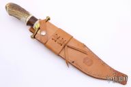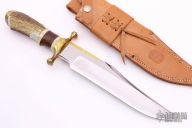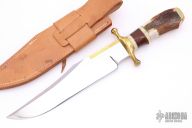 This bowie by R.H.R Grand features a satin finished bowie blade with a nearly sharpened top edge and a brass back with hammer finish, .354" blade stock and 2.034" blade depth, hidden tang construction. The handle has a brass guard and butt, stag grip with bone/brass/brown canvas micarta spacers. Comes with a brown leather sheath. Excellent condition.